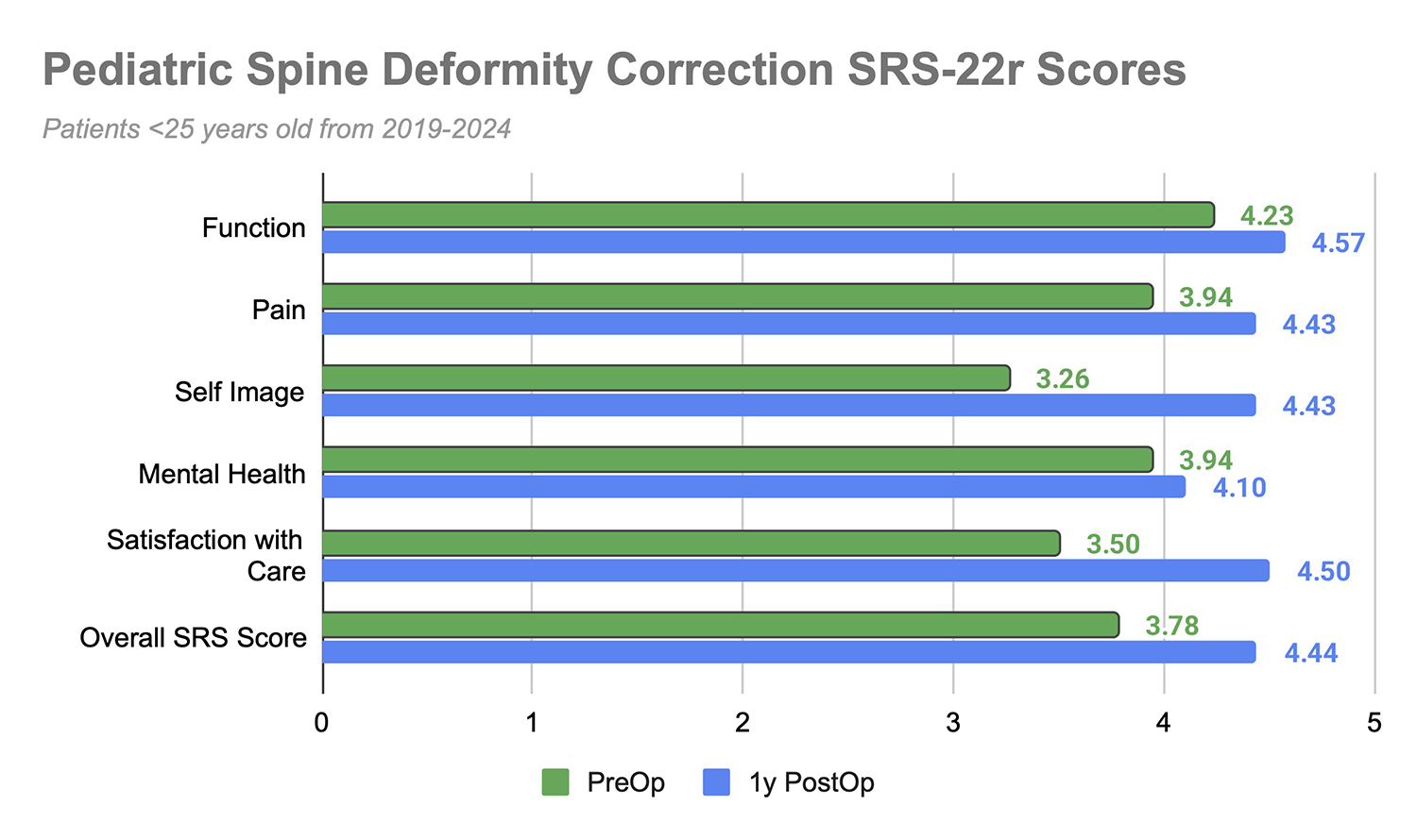 Clinical outcomes collected at Texas Spine and Scoliosis for pediatric and adolescent scoliosis treatment involves patient forms completed before treatment and after treatment at various intervals. Patient Reported Outcomes (PRO) are considered to be the most valid measurement of clinical care related to the patient's assessment of their function, pain level, self image, mental health and satisfaction of the care provided by the clinicians at Texas Spine and Scoliosis.