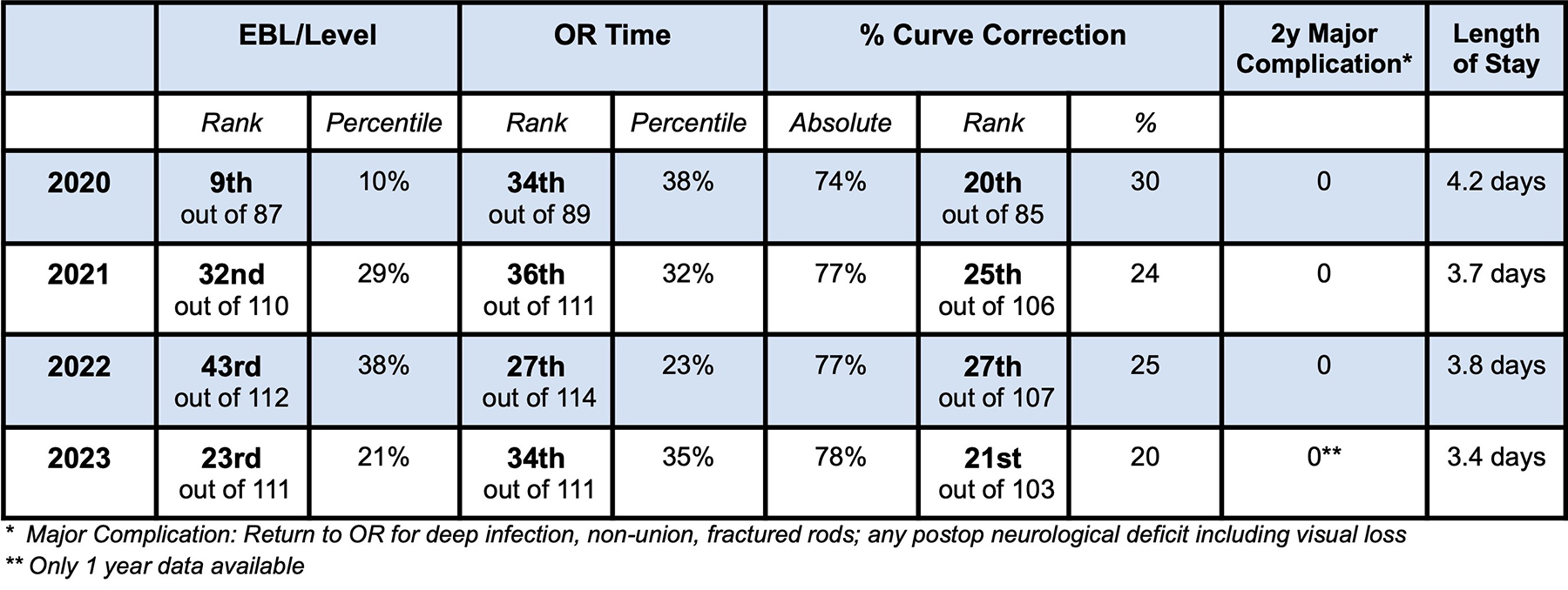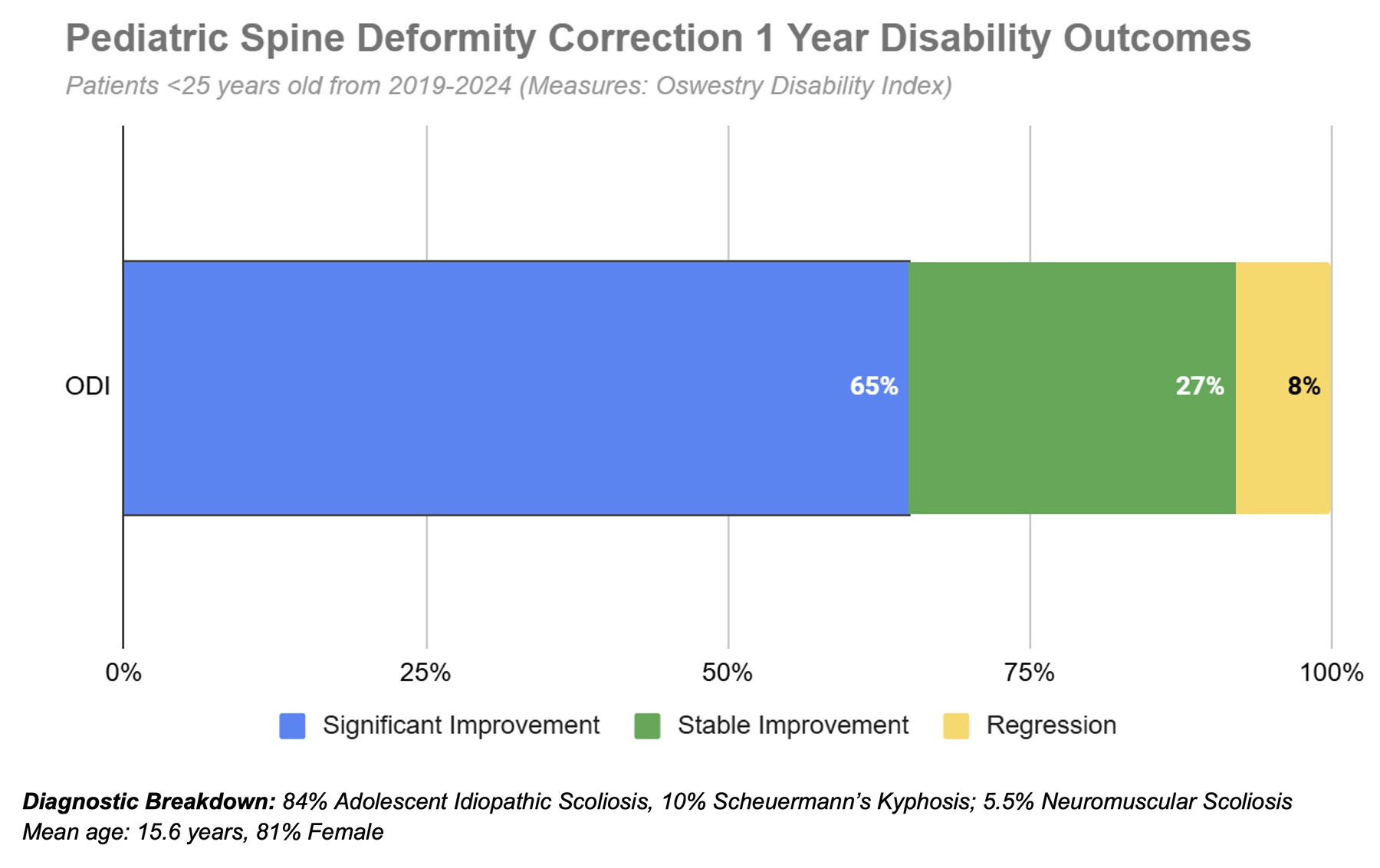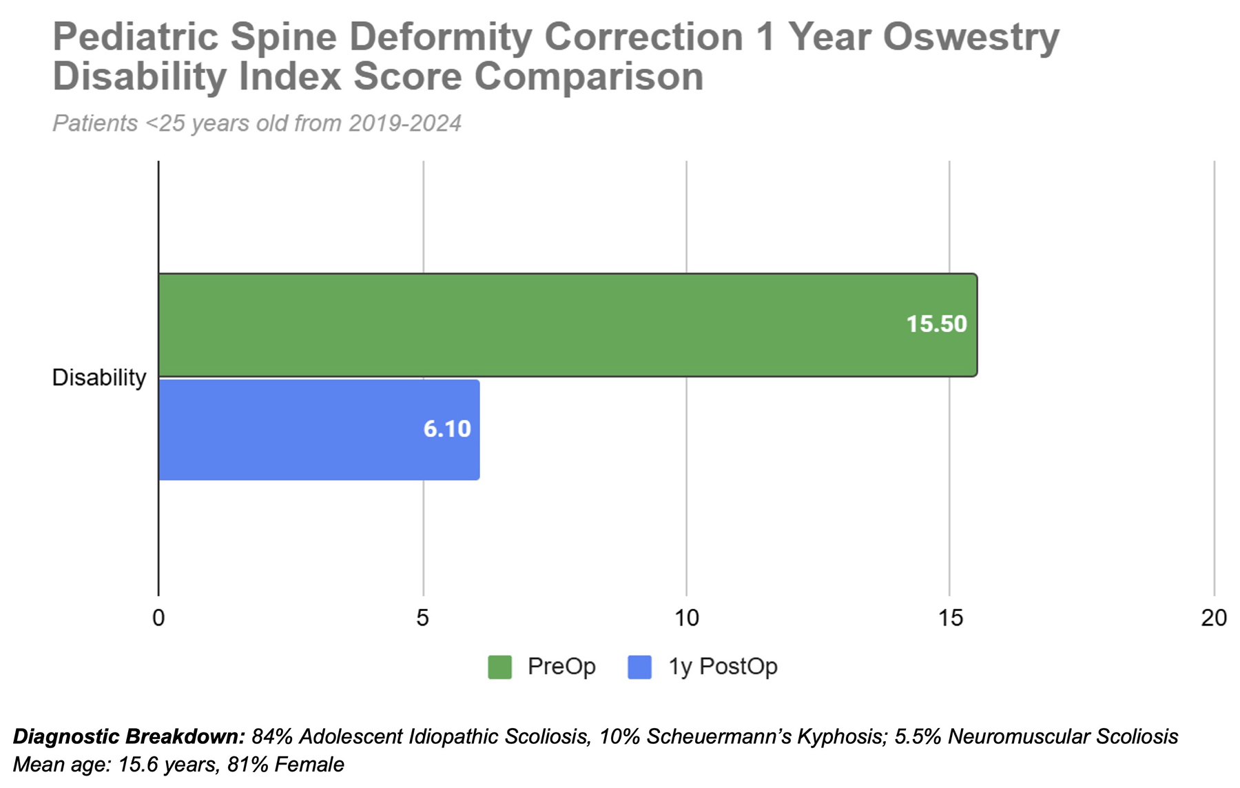 The OSWESTRY is a standardized spine assessment tool used for 50 years within the spine field that measures a patient’s function over a range of activities and compares that to a national database. SRS stands for data assembled over decades by the Scoliosis Research Society, the most respected international group of scoliosis specialists. The data presented here is collected and aggregated by a clinical outcome data professional within the spine center.